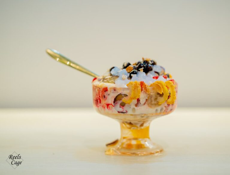 Kulfi ice cream, vermicelli, basil seeds, rose syrup, various fruits, nuts